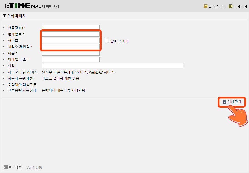 현재의 임시 암호와 새 암호 등 사용자 정보를 입력한 후 저장하기 버튼을 누른다.