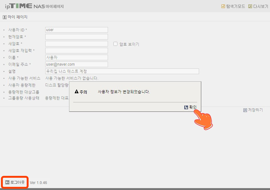 사용자 정보가 변경되었다는 메시지가 나타나면 확인 버튼을 누른 후, 화면 왼쪽 아래의 로그아웃 버튼을 눌러 로그아웃한다.